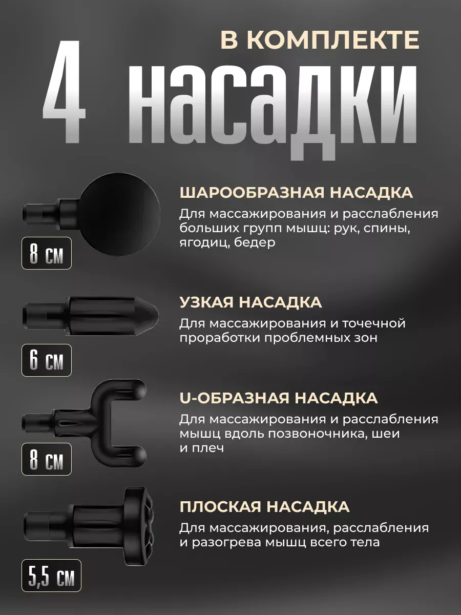 Количество насадок: 4 массажные головки для проработки различных групп мышц.
